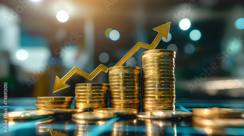 Financial growth concept with stacks of golden coins and a digital rising arrow graph in a futuristic setting, depicting investment success