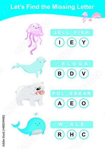 Find the missing letter worksheet. Preschool worksheet with sea animals’ theme. Educational spelling printable game worksheet. Vector illustration.
