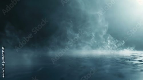 Fine mist rising off a smooth dark surface under soft light