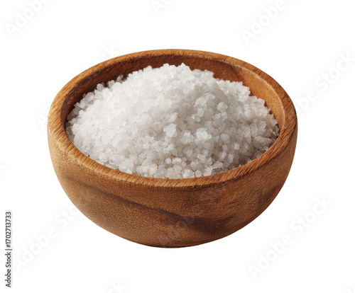 Fine white salt crystals in a small wooden bowl