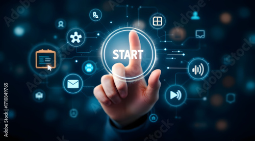 Finger pressing digital start button with glowing technology icons