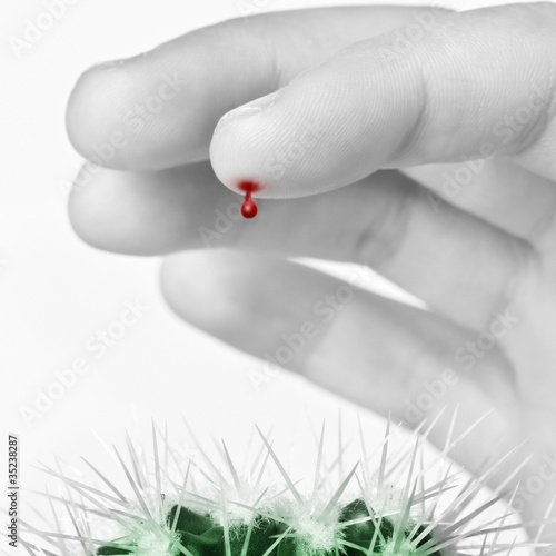 Finger with a blood drop pricked by cactus