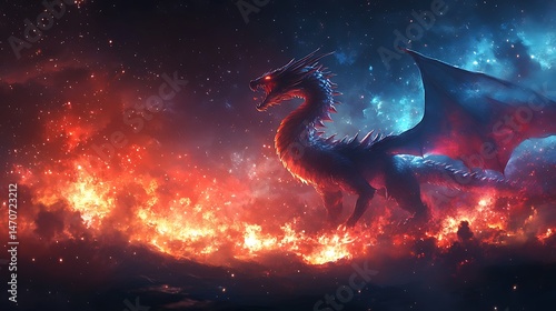 dragon, fantasy, fire, mystical, creature, myth, legend, wing, cosmic, night, star, glowing, magic, powerful, sky, space, nebula, epic, fiery, artwork, illustration, digital, mysterious, galaxy, star, astronomy, animal, cosmos, vector, light, universe, moon, design, dark, art, cartoon, spiral, sun, background, science
