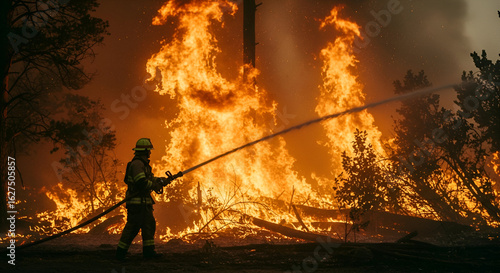 firefighter, fire, flames, smoke, emergency, rescue, forest, wildfire, courage, bravery, danger, nature, disaster, smoldering, smoky, action, hero, extinguish, water, hose, battle, heat, intensity, hot, night, glow, urgent, environment, devastation, spark, ash, threat, teamwork, crisis, protection, safety, effort, resilience, strength