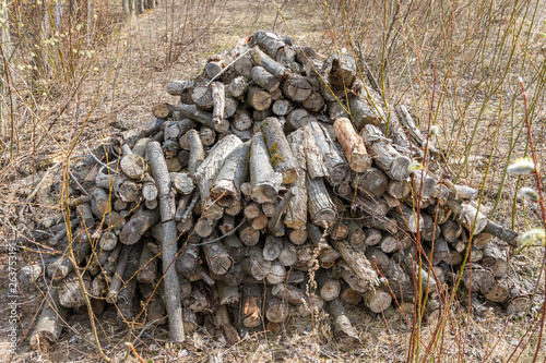 Firewood, stacked in a woodpile after the winter snow.
