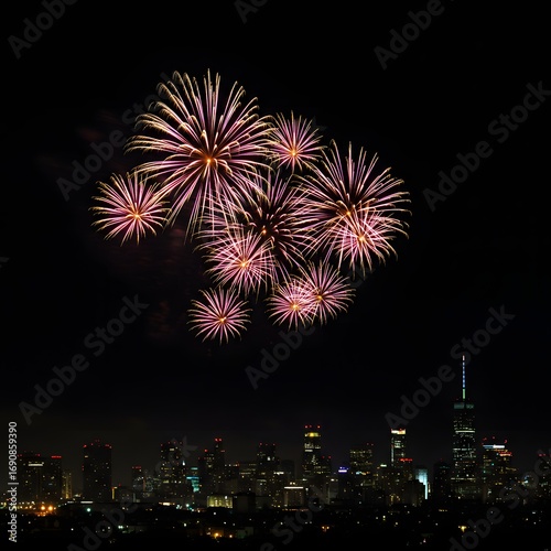 Fireworks exploding in the night sky above a city skyline silhouette, with dark sky and space below for text.