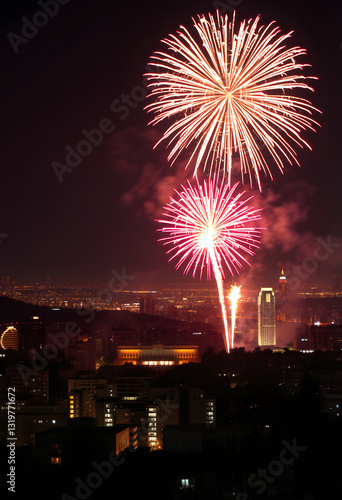 fireworks, night, city landscape, joyous, patriotic, celebration, 4th july, isolated, bright, colourful, explosive, dazzling, display, spectacle, sky, light, event, show, vibrant, sparkling, festive, grand, magnificent, traditional, family, friends, gathering, tradition, freedom, nation, pride, oneness, community