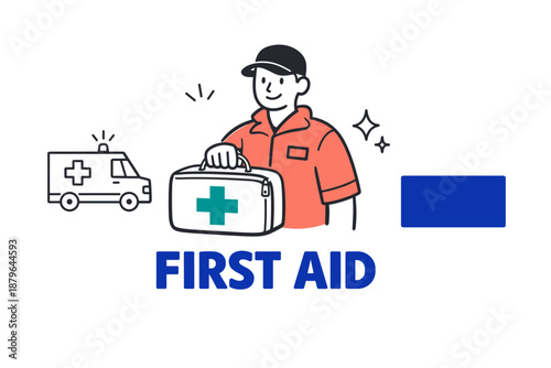 first, aid, concept, male, paramedic, ambulance, kit, illustration, health care, medicals, emergency, cartoon, graphic, uniform, red, cross, cap, caucasian, adult, help, rescue, safety, service, icon, signs, drawing, character, response, professional, equipment, blue, background, design, transportation, vehicle, symbol, support, care