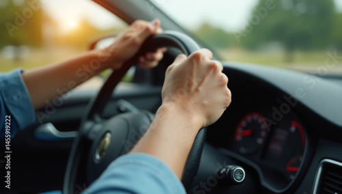 First driving lesson. Driver's hand on the steering wheel in tension.