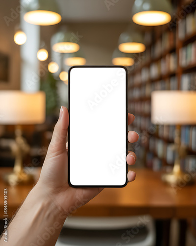 phone, smartphone, mobile, hand, holding, device, screen, blank, white, display, copy, space, library, bookshelf, book, reading, education, learning, student, study, table, desk, lamp, light, warm, interior, cosy, person, application, app, browsing, cyberspace, digital, technology, communication, lifestyle, leisure, portable, empty, vertical, business, commerce, marketing, advertising, cognition, academic, literature, reference