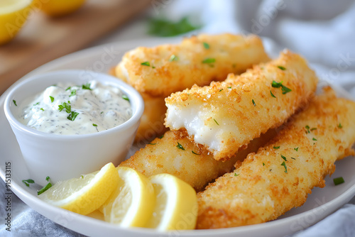 Fish sticks with lemon and tartar sauce commercial food photo