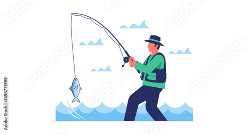 fishing, fisherman, fish, water, ocean, recreation, hobby, leisure, cartoon, illustration, summer, activity, sport, angling, lake, nature, catch, sea, rod, coastline, wave, isolated, design, line, lifestyle, vacation, travel, graphic, fun, element, art, catching, equipment, person, flat, calm, sky, angler