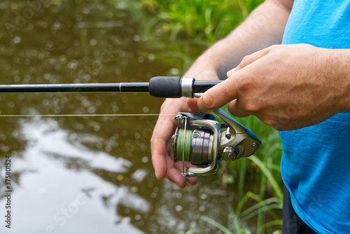 fisherman hand with spinning and reel on the summer lake, close-up.