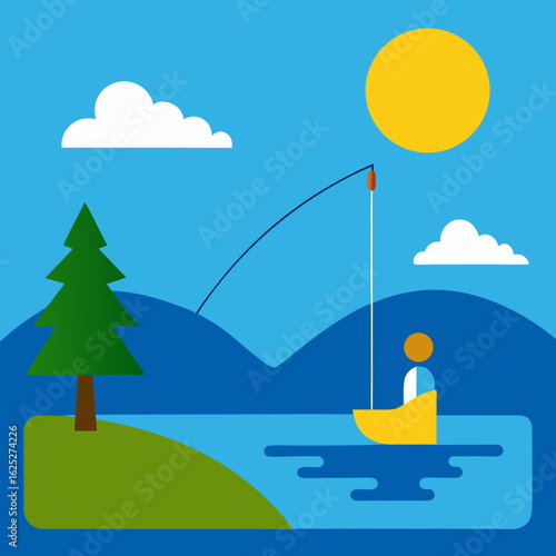 fishing, fisherman, boat, lake, water, nature, outdoors, recreation, hobby, summer, sunny, sky, cloud, hill, landscape, illustration, vector, minimalist, flat, design, cartoon, childlike, peaceful, calm, relaxation, activity, sport, leisure, daytime, scenic