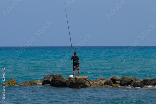 Fisherman on Coastal Rocks Fishing in Mediterranean Sea, Cyprus