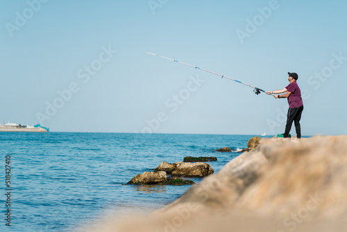 activity, alone, angler, blue skies, blur, cap, casual attire, catch, cliff, cloudless, coast, embankment, equipment, fisherman, fishing, free time, full body, full-length, gear, hobby, horizon, horizontal, lifestyle, male, man, marin, outdoors, pull, quay, rocky, rod, sea, seafront, shore, half face, skill, summer, sunny, tackle, tradition, water