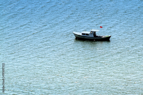 Fishing boat with Turkish flag on blue sea in Turkey.