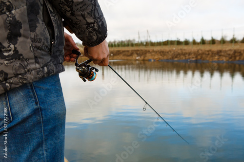 Fishing rod in the hands of a fisherman on the lake. Fisherman's hands with spinning on the background of water