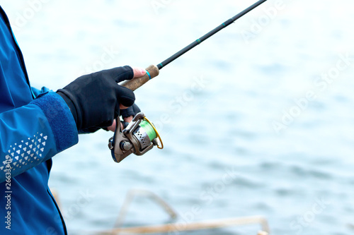 Fishing. The hands of man hold a fishing rod and wheel closeup..