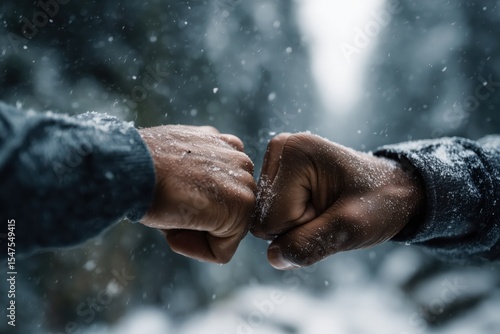 Fist bump between two friends in snowy forest during winter season