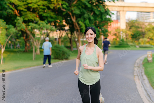 Fit Asian young woman jogging in park smiling happy running and enjoying a healthy outdoor lifestyle. Female jogger. Fitness runner girl in public park. healthy lifestyle and wellness being concept