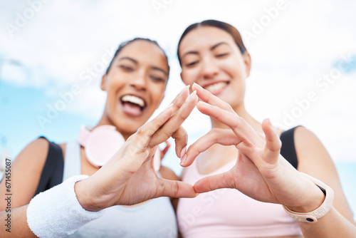 Fitness, heart and health with hands of women for sports workout, exercise and cardio lifestyle in nature together. Wellness, peace and happy with friends for summer, smile and training in outdoor