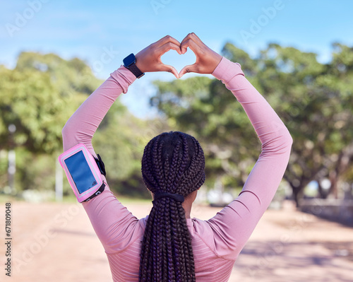 Fitness, heart hands and black woman with phone monitor for running, cardio and workout progress, health and data. Sports person rear or athlete runner with love emoji and smartphone for training