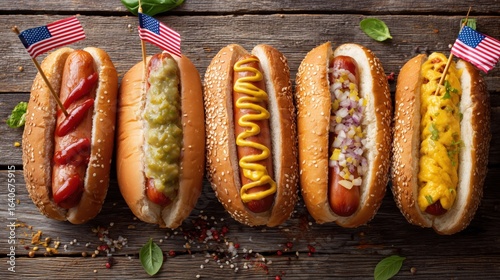 Five American-style hot dogs with different toppings like ketchup, mustard, relish, onions, and cheese sauce, decorated with small USA flags on a rustic wooden table.