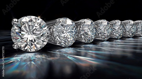 Five brilliant-cut diamonds set in a row, reflecting light on a dark surface.