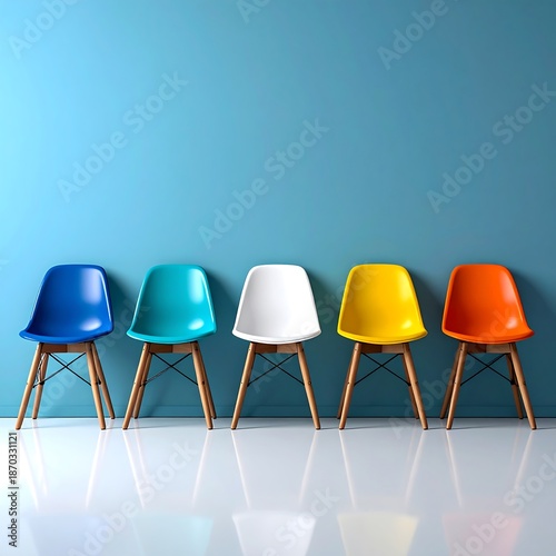 chair, colourful, blue, wall, room, interior, design, furniture, modern, minimalist, empty, row, office, waiting, clinic, reception, vibrant, clean, perspective, shiny, reflective, floor, light, shadow, plastic, wood, seating, arrangement, indoor, contemporary