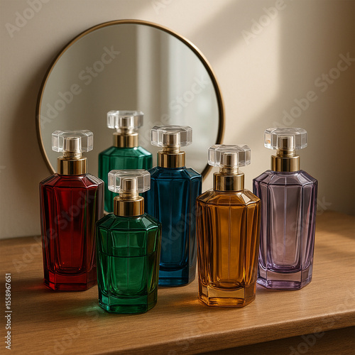 Five Colorful Glass Perfume Bottles with Round Mirror on Wooden Table