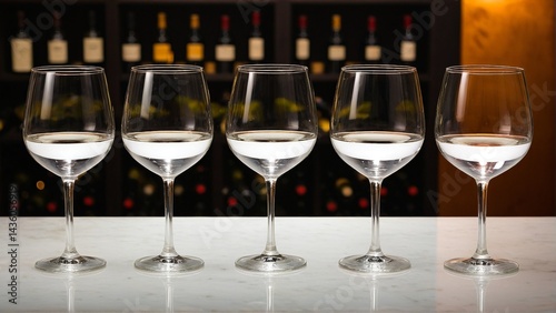 Five elegant wine glasses, each containing a measure of clear liquid, stand in a row, poised for a tasting.
