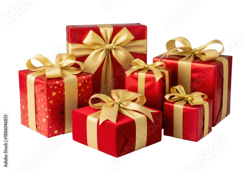 gift, box, red, gold, ribbon, christmas, festive, celebration, studio, luxury, velvet, glossy, wrapping, present, holiday, elegance, arrangement, composition, white, grey, polished, star, bow, satin, silk, crimson, ruby, vibrant, colourful, detail, photorealistic, still life, product, closeup, overhead, presentation, anticipation, joy, giving, thoughtful, neat, assortment, stack, design