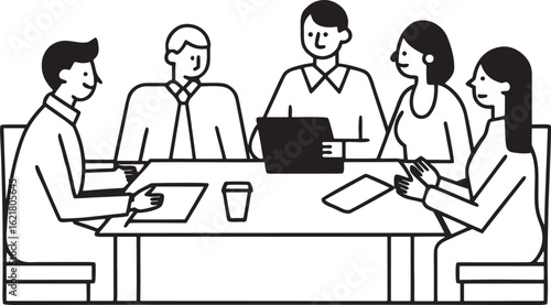 meeting, business, people, team, collaboration, discussion, office, work, group, table, laptop, paper, communication, planning, strategy, brainstorming, presentation, corporate, teamwork, employee, colleague, professional, sitting, indoor, casual attire, simple, flat, vector, illustration, graphic, black-and-white, white background, businessperson