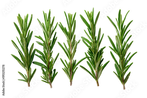 Five sprigs of fresh rosemary isolated on transparent background. Fresh green rosemary herb sprigs isolated on white background.