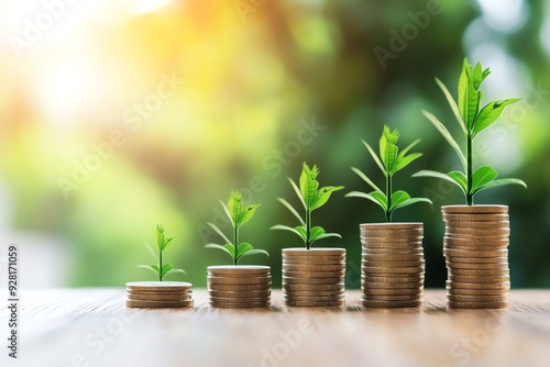 Five stacks of coins with green plants sprouting on top, representing the growth of financial investments and sustainable wealth over time.