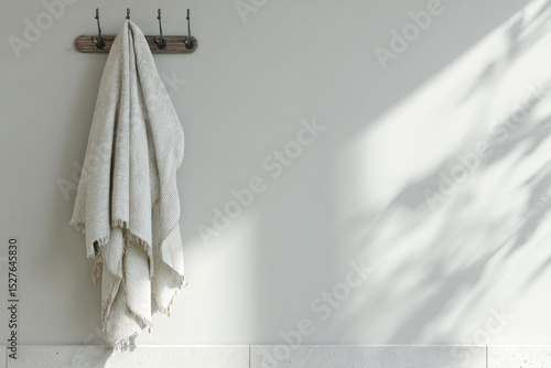 blanket, hanger, minimalist, spa, serene, natural light, shadow, interior, decor, textile, relaxation, calm, peaceful, soft, neutral, simple, elegant, cosy, warmth, texture, design, home, lifestyle, calmness, comfort, aesthetic, modern, clean, tidy, organised, soothing, gentle, light, wall, hook, hanging, fabric, safety, protection