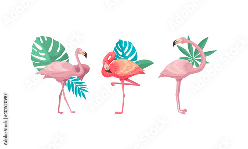 Flamingo in Different Poses with Tropical Leaves Behind Vector Set