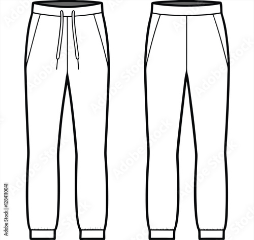 Flat activewear fashion unisex trouser joggers jeans cargo pants apparel front and back views, CAD design, mock-up, template, vector, clothing, technical drawing, fashion, illustration, line art.