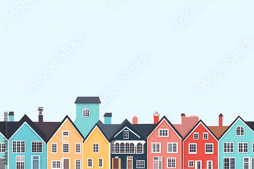 Flat art illustration of multi-colored house facades, showcasing simple geometric shapes and vibrant colors, creating a playful and modern urban aesthetic.