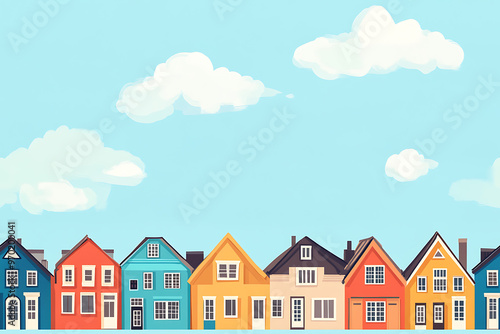 Flat art illustration of multi-colored house facades, showcasing simple geometric shapes and vibrant colors, creating a playful and modern urban aesthetic.
