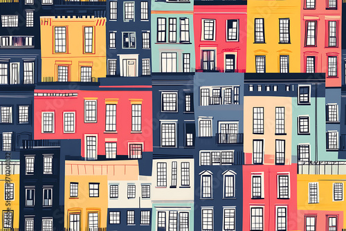 Flat art illustration of multi-colored house facades, showcasing simple geometric shapes and vibrant colors, creating a playful and modern urban aesthetic.