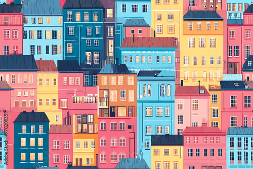 Flat art illustration of multi-colored house facades, showcasing simple geometric shapes and vibrant colors, creating a playful and modern urban aesthetic.