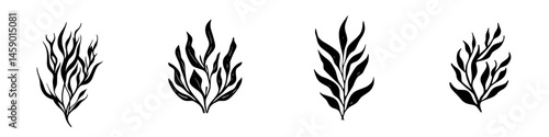 Flat black botanical icons depicting various plant shapes in a minimalist style for design and decoration use