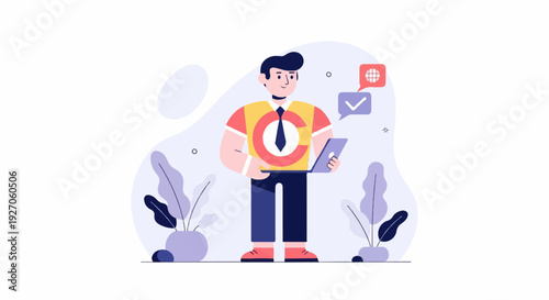flat, design, illustration, man, laptop, holding, computer, technology, cyberspace, online, communication, chat, message, notification, check, mark, success, confirmation, globe, earth, business, work, office, career, professional, modern, abstract, background, plant, leaf, nature, green, purple, blue, yellow, red, white, simple, clean, minimal, graphic, vector, character, person, male, employee, digital, workflow