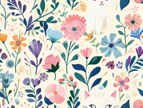 flat digital vector, Spring Floral Easter cat, pastel bright colors