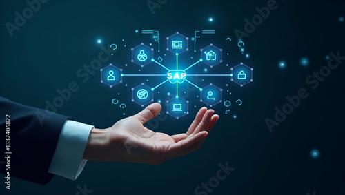 Flat Hand Engaging with Holographic SAP System Interface: Showcasing Business Process Automation, AI Integration, and Cloud Computing Icons for Modern Enterprise Solutions in a Cute Vector Style