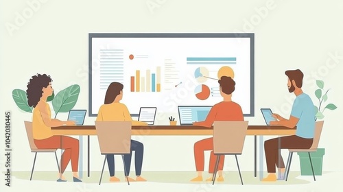 meeting, conference, teamwork, discussion, collaboration, planning, presentation, office, technology, laptop, tablet, datum, analysis, strategy, workspace, group, diverse, idea, communication, business, chart, graphic, people, interaction, brainstorming, design, layout, professional, casual attire, environment, digital, team, colours, modern, screen, research, concept, working, project