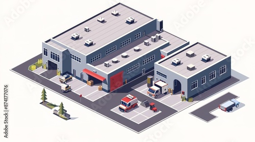 Flat illustration of an urban warehouse with a focus on industrial elements and edgy accents, symbolizing industrial interiors and urban style, with space for text