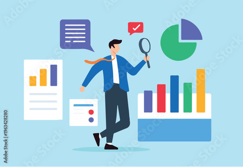 Flat illustration of businessman analyze data with magnifying glass examining chart report optimization marketing financial insight analytic information